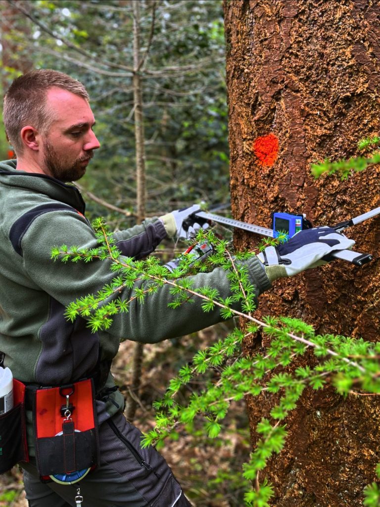 Onze specialisatie binnen het bosbeheer richt zich op blessen en houtoogst voorbereiding en dat is méér dan een stip op een boom spuiten — het is actief sturen op de toekomst van het bos. Welke bomen mogen doorgroeien? Welke maken plaats? Met elke keuze geven wij richting aan de ontwikkeling van de structuur, soortenmening en uitstraling van het bos. Of het nu gaat om vitale, rechte bomen voor kwalitieitshout of om karaktervolle veteranen bomen vol holtes en kansen voor de biodiversiteit: met goed en vakkundig blessen maken wij het verschil. Ook het markeren van dunningspaden op de gewenste afstand kunnen wij verzorgen zodat de bosexplatatie efficiënt en zorgvuldig uitgevoerd kan zonder onnodige schade aan het bos te hoeven toe te brengen.